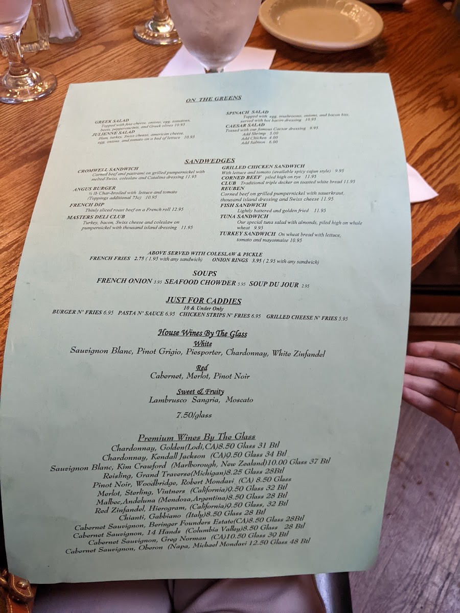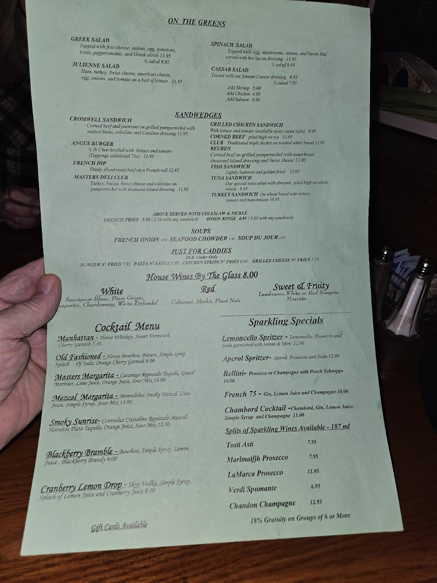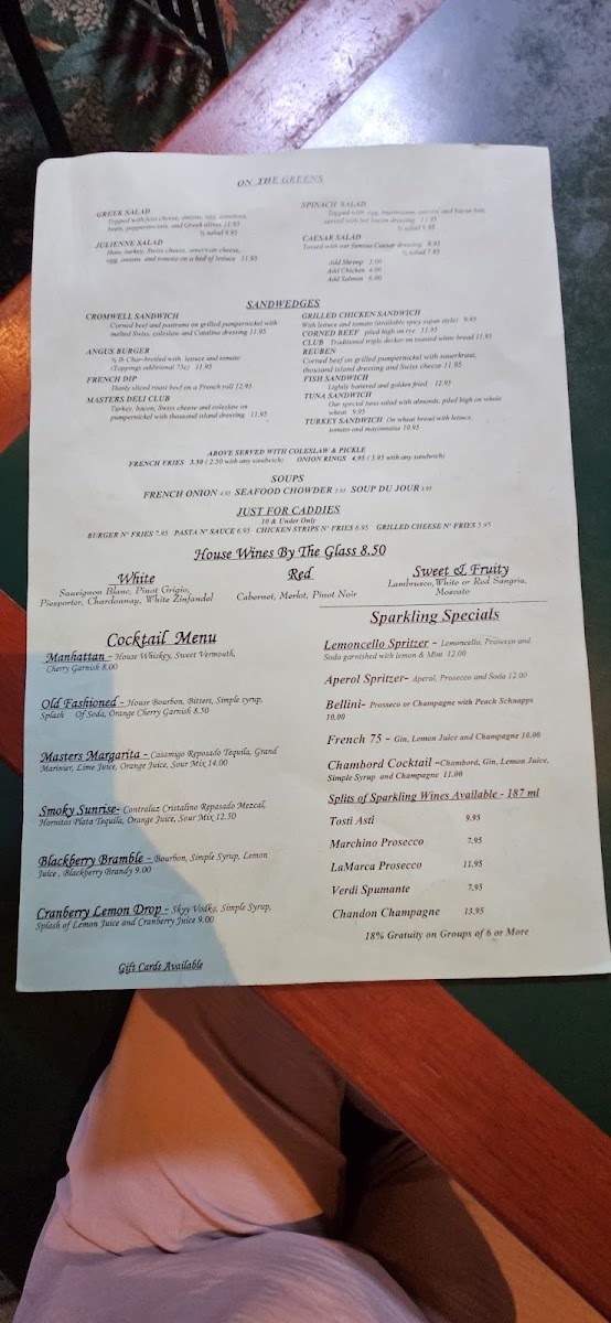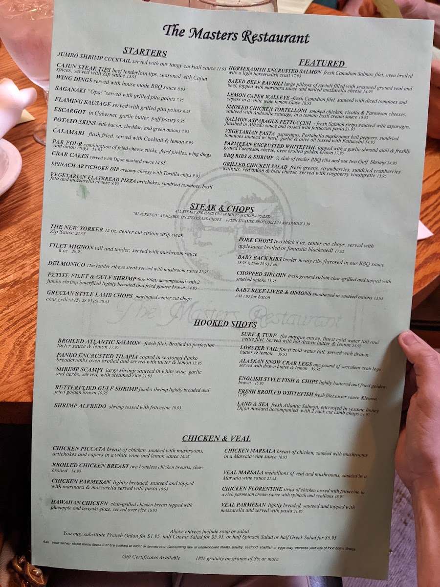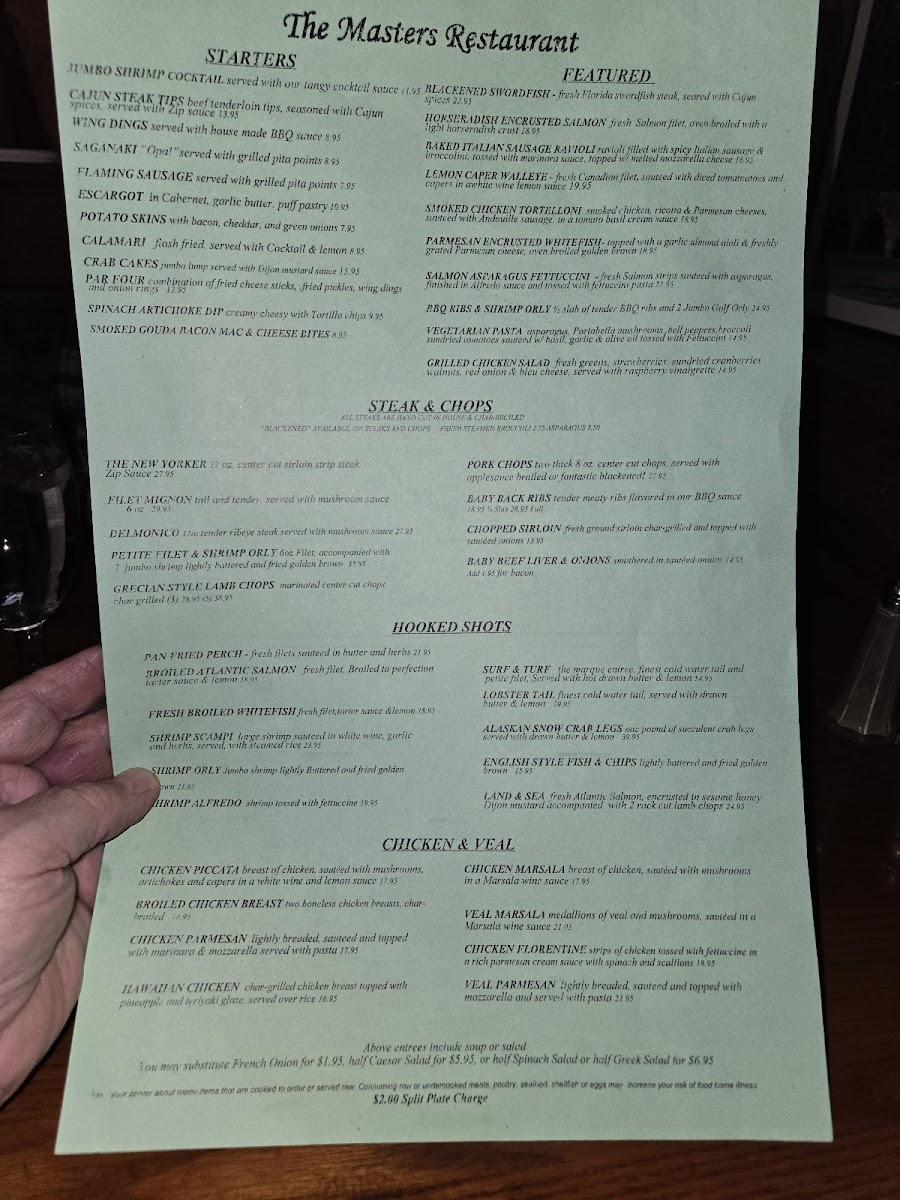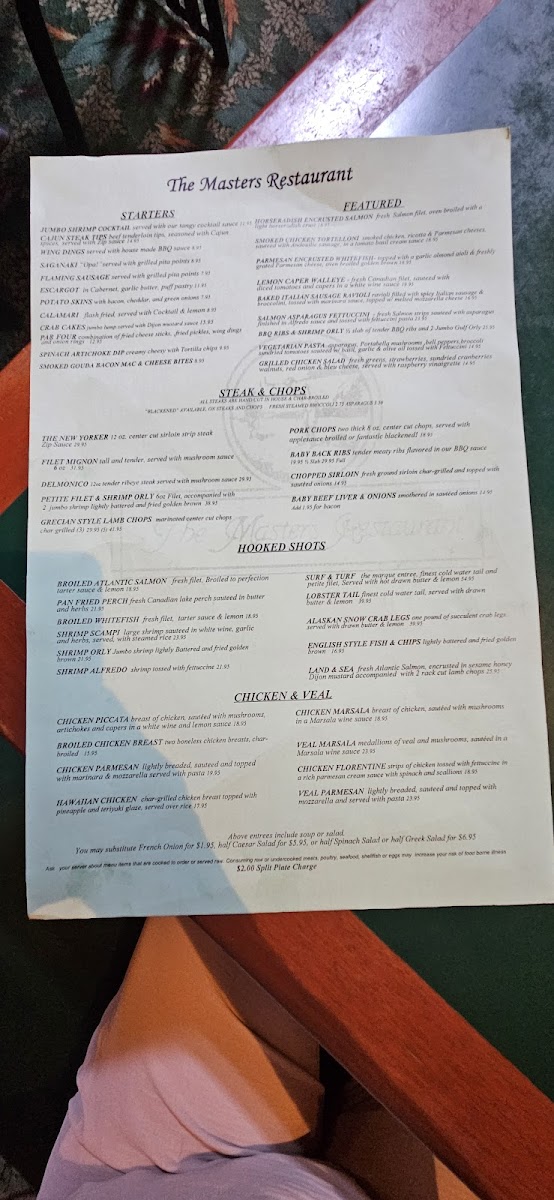 The Masters Restaurant offers a diverse menu featuring a variety of selections typical for a steak house with bar and restaurant services. The menu is organized into several main categories to accommodate different dining preferences, including entrees, light meals, and desserts.